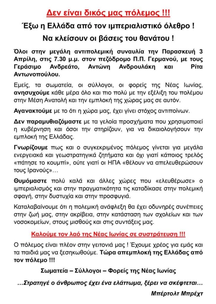 «Καμία εμπιστοσύνη στην κυβέρνηση και στα κόμματα που συμφωνούν με τους μακελάρηδες του ΝΑΤΟ και της ΕΕ. Τα δάκρυά τους είναι ψεύτικα. Όλοι αυτοί μαζί την περίοδο της ιμπεριαλιστικής ειρήνης μάς ληστεύουν για τα κέρδη τους και την περίοδο του ιμπεριαλιστικού πολέμου θα μας ληστεύουν και θα μας σκοτώνουν, πάλι για τα κέρδη τους».