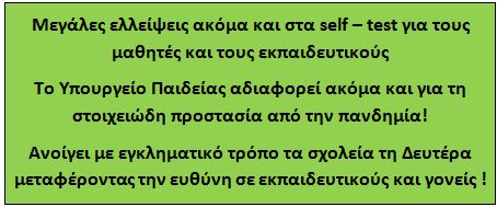 Καταγγέλλουμε την κυβερνητική κοροϊδία ότι δήθεν τα σχολεία ανοίγουν με αυτούς τους όρους για εκπαιδευτικούς και ψυχοσυναισθηματικούς λόγους. Αν η κυβέρνηση ενδιαφέρεται για την αντιμετώπιση των εκπαιδευτικών και ψυχοκοινωνικών προβλημάτων οφείλει να πάρει υπόψη της και να ικανοποιήσει τις πολύ συγκεκριμένες προτάσεις που έχουν καταθέσει τα εκπαιδευτικά σωματεία εδώ και καιρό: